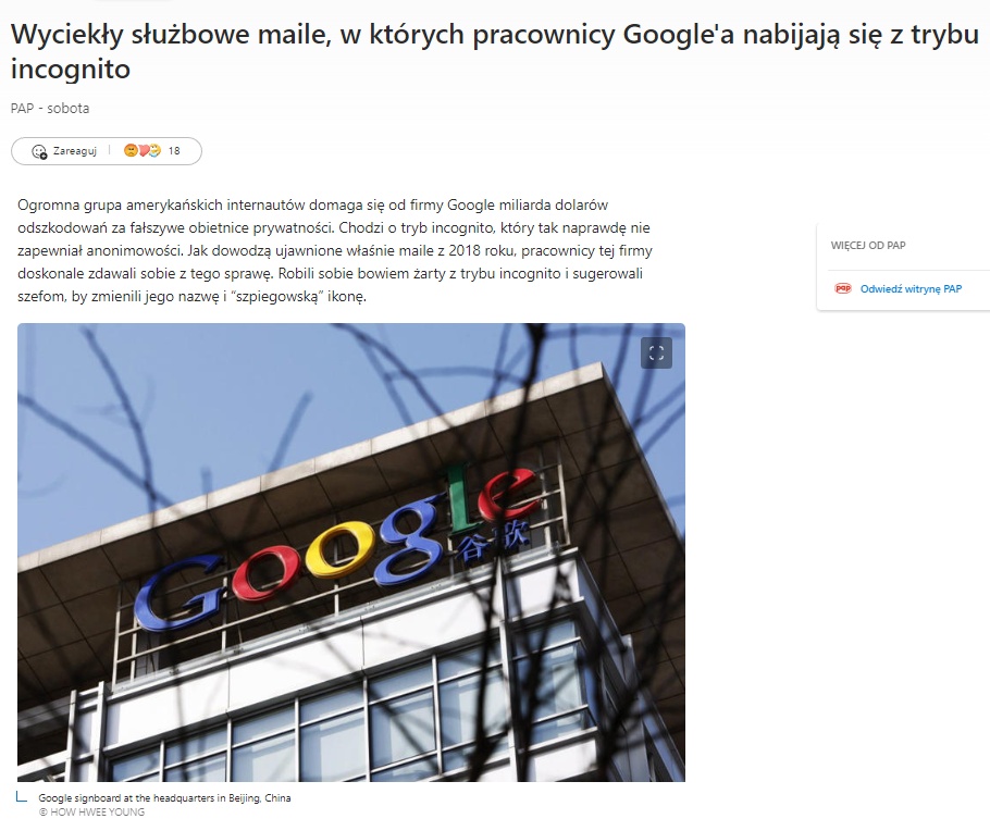 Wyciekły służbowe maile, w których pracownicy Google'a nabijają się z trybu incognito. No, ale jak to tak, przecież tylko Chiny inwigilują :)