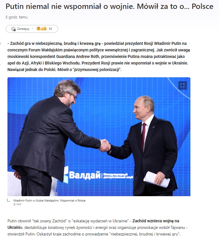 Putin na corocznym Forum Wałdajskim "Rosja nie uważa się za wroga Zachodu". Powiedział, że "Zachód odrzucił rosyjskie próby zbudowania dobrych stosunków ze Stanami Zjednoczonymi i NATO, ponieważ był nastawiony na osłabienie Rosji".