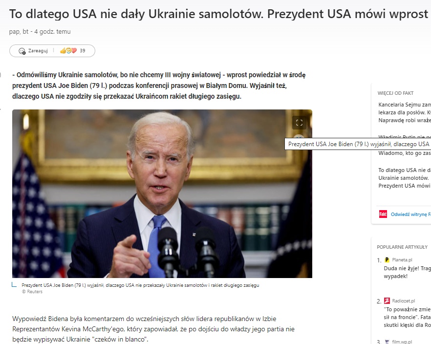 To dlatego USA nie dały Ukrainie samolotów. Prezydent USA mówi wprost