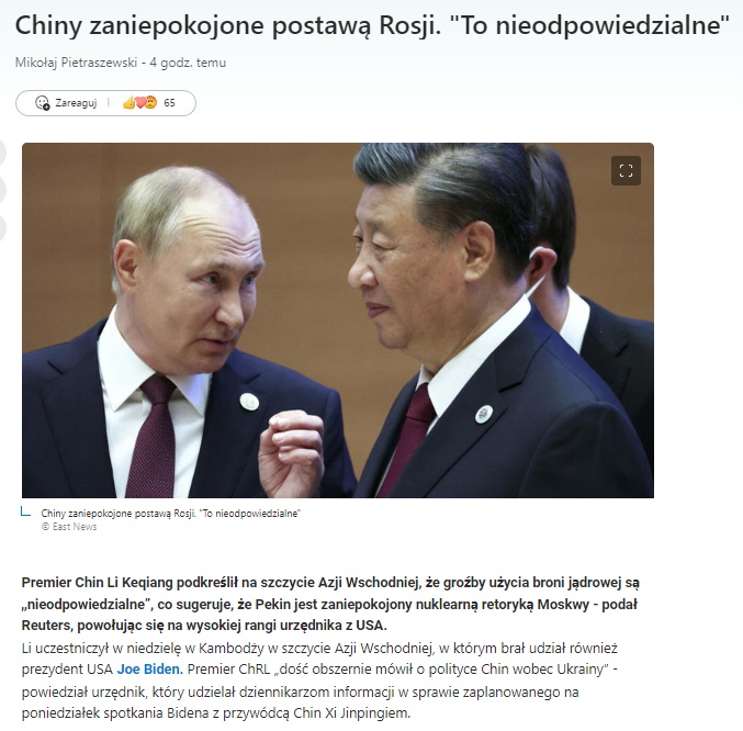 Chiny zaniepokojone postawą Rosji. "To nieodpowiedzialne"