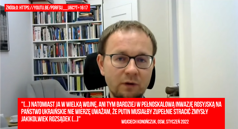 "[...] Natomiast ja w wielką wojnę, ani tym bardziej w pełnoskalową inwazję rosyjską na państwo ukraińskie nie wierzę uważam, że Putin musiałby zupełnie stracić zmysły jakikolwiek rozsądek [...]" Wojciech Konończuk, OSW, styczeń 2022